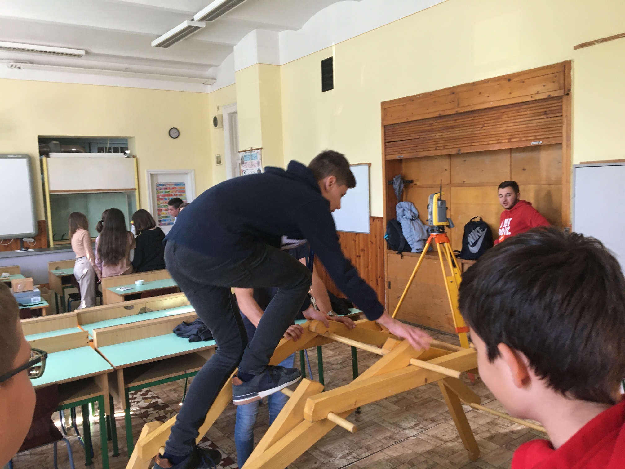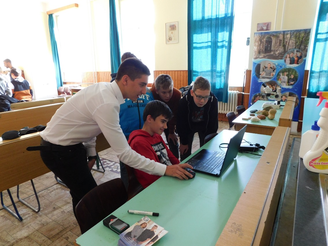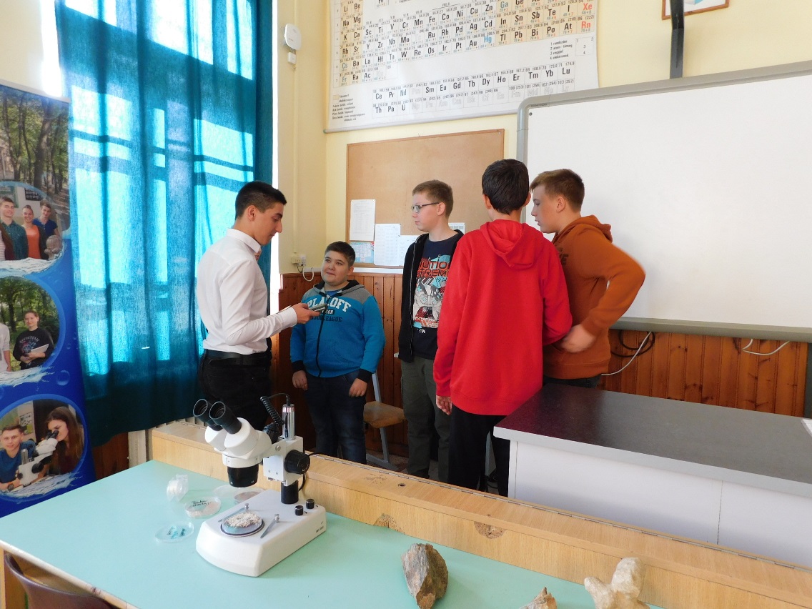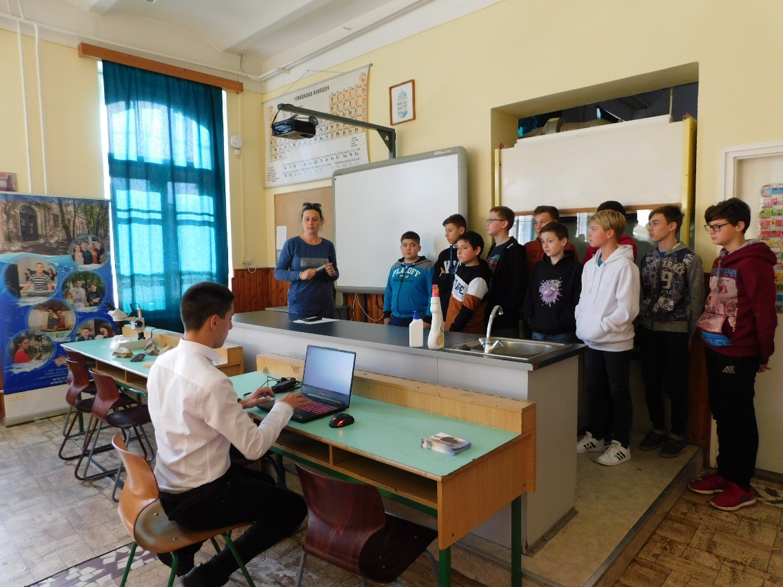 A mai napon ismét ellátogatott hozzánk Kiss Péter kollégám, aki a Mobillabor program keretében ismét különlegesebbnél különlegesebb kísérlettel kápráztatott el minket. Idén szinte olyan kísérletekkel érkezett, amelyeket tanulók segítségével oldott meg. A tanulókkal készítettek elefántfogkrémet, lángot festettek, meggyújtották a metil-alkoholt. Villámokat állított elő egy kémcsőben.