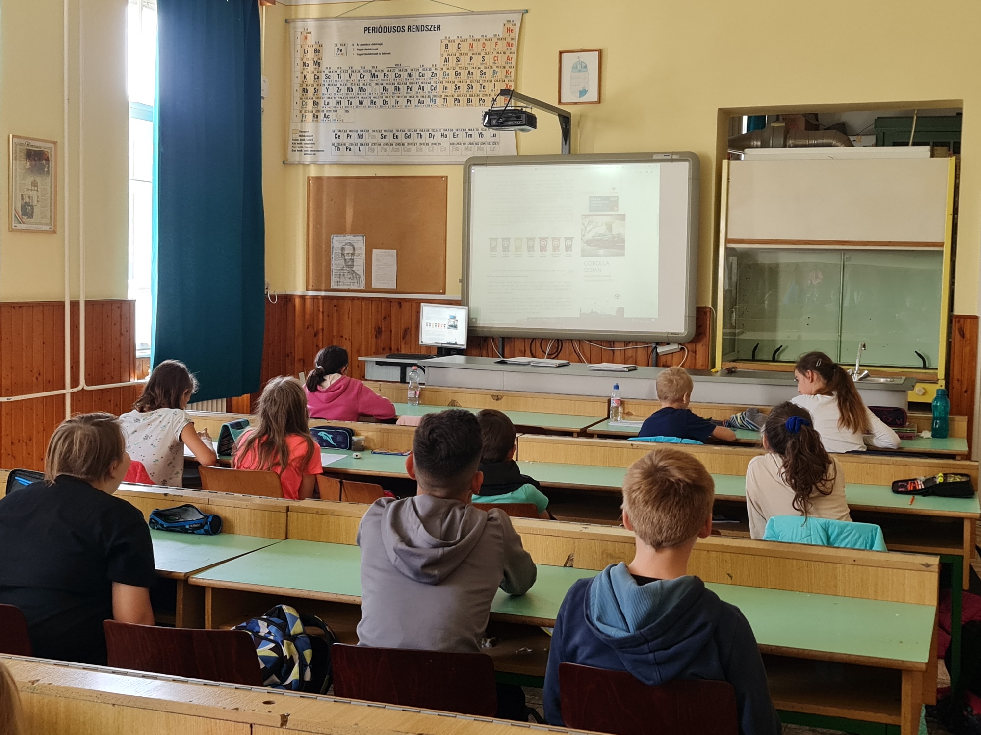 A mai napon ismét ellátogatott hozzánk Kiss Péter kollégám, aki a Mobillabor program keretében ismét különlegesebbnél különlegesebb kísérlettel kápráztatott el minket. Idén szinte olyan kísérletekkel érkezett, amelyeket tanulók segítségével oldott meg. A tanulókkal készítettek elefántfogkrémet, lángot festettek, meggyújtották a metil-alkoholt. Villámokat állított elő egy kémcsőben.